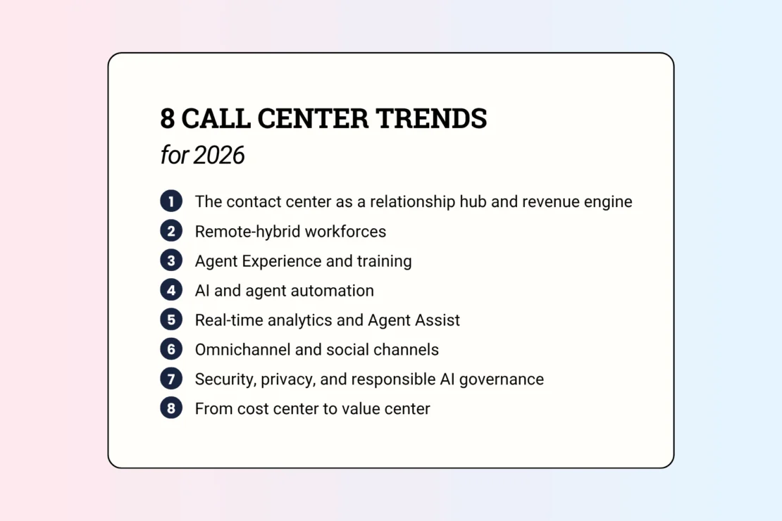 - The contact center is evolving into a strategic value and revenue hub. By 2026, leading organizations will treat their contact centers as value centers, blending human empathy with AI to drive customer trust, satisfaction, and long-term loyalty.
