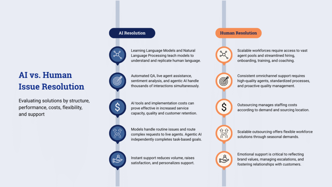 - AI solutions: AI tools such as agentic programs, automated routing and QA, and live agent assistance handle routine queries, maximizing support capacity for higher quality, satisfaction, and efficiency.
