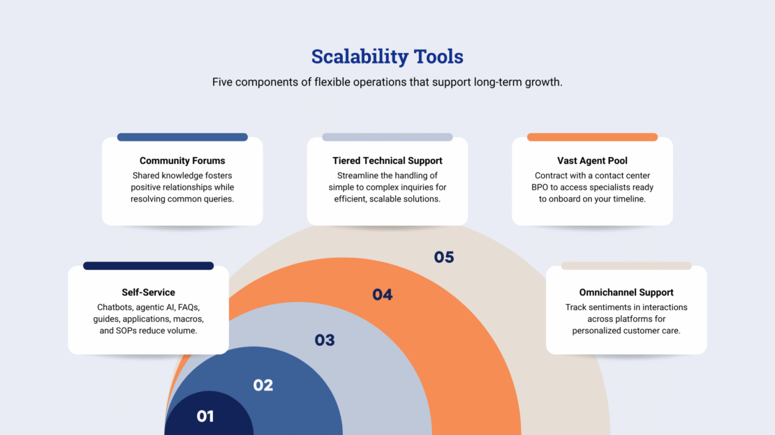 Scaling customer support teams requires a powerful, affordable operational strategy that meets support needs on short- and long-term scales. This enables businesses to manage fluctuations in demand with flexible workforces, reducing overwhelm for consistent service, optimized costs, and continuous success.