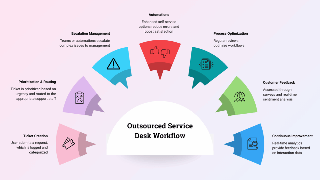 - Outsourcing a service desk boosts efficiency, scalability, and cost-effectiveness by providing 24/7 expert IT support, reducing internal staffing costs, and providing flexibility to scale support based on demand.